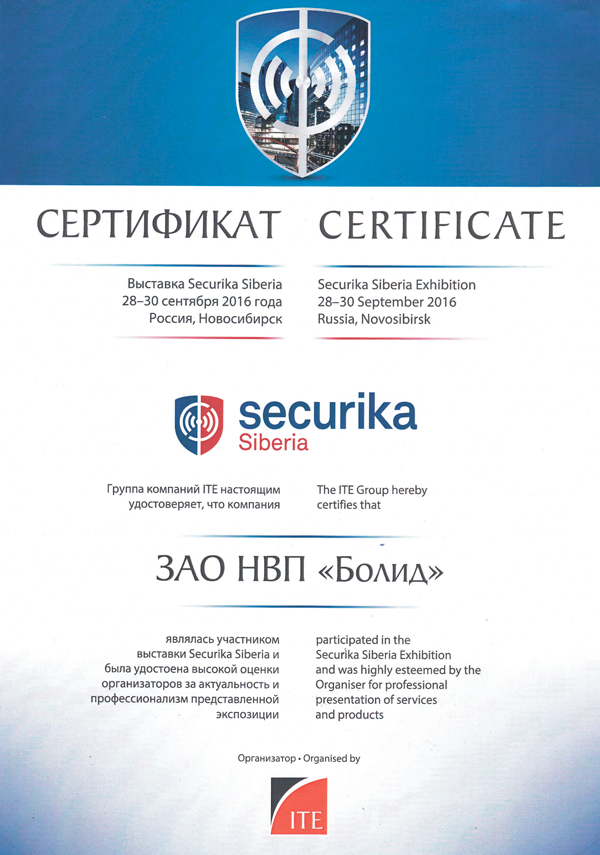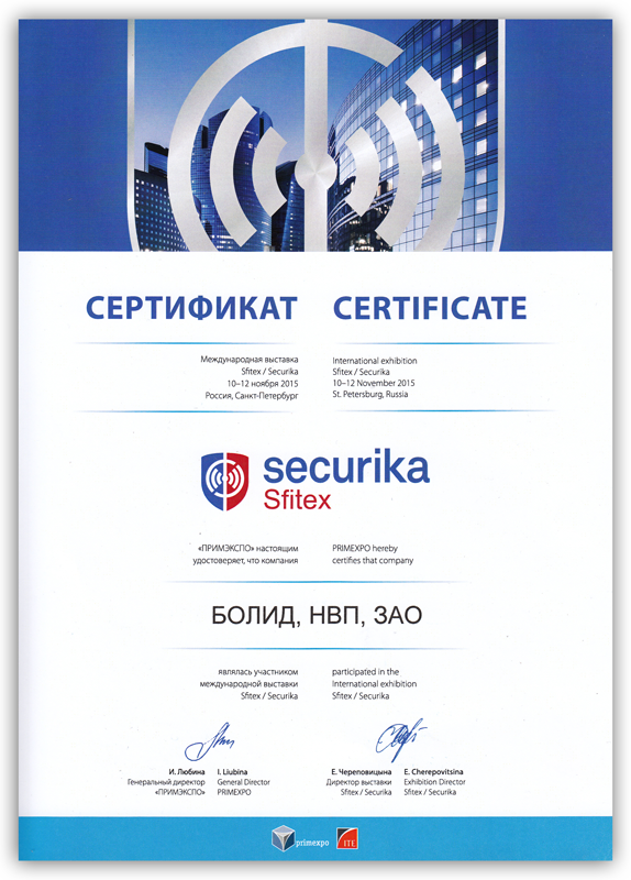 Награда: Диплом участника выставки Securika/Siberia-2015