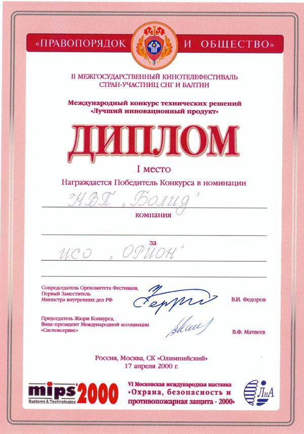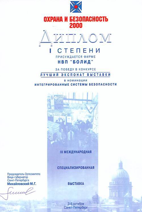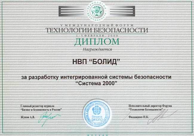 Награда: Диплом за разработку "Интегрированной системы безопасности "Система 2000"