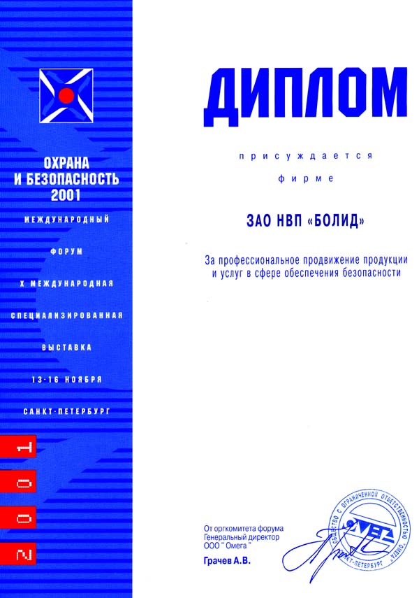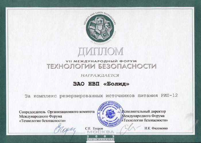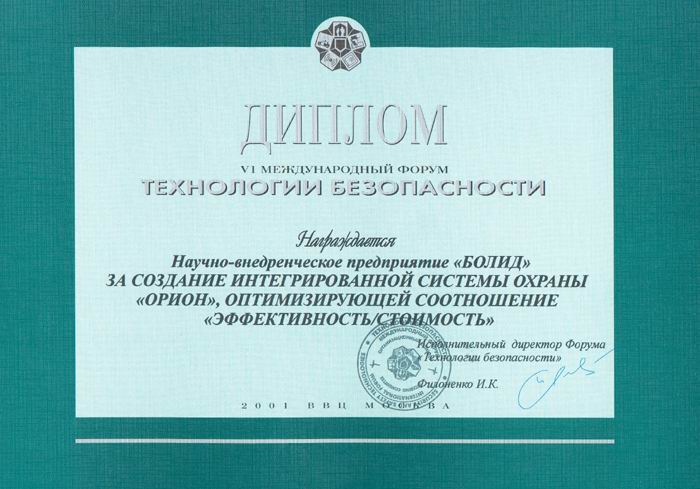 Награда: Диплом за создание Интегрированной системы охраны "Орион", оптимизирующей соотношение "эффективность / стоимость"