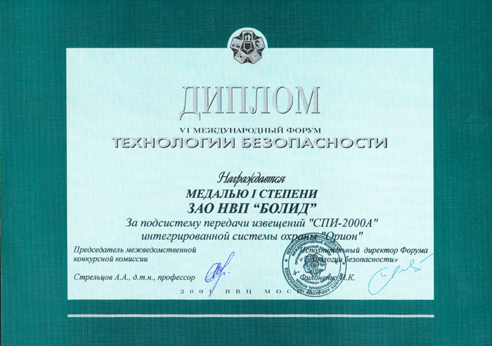 Награда: Диплом и медаль I степени за Подсистему передачи извещений "СПИ-2000А" Интегрированной системы охраны "Орион"