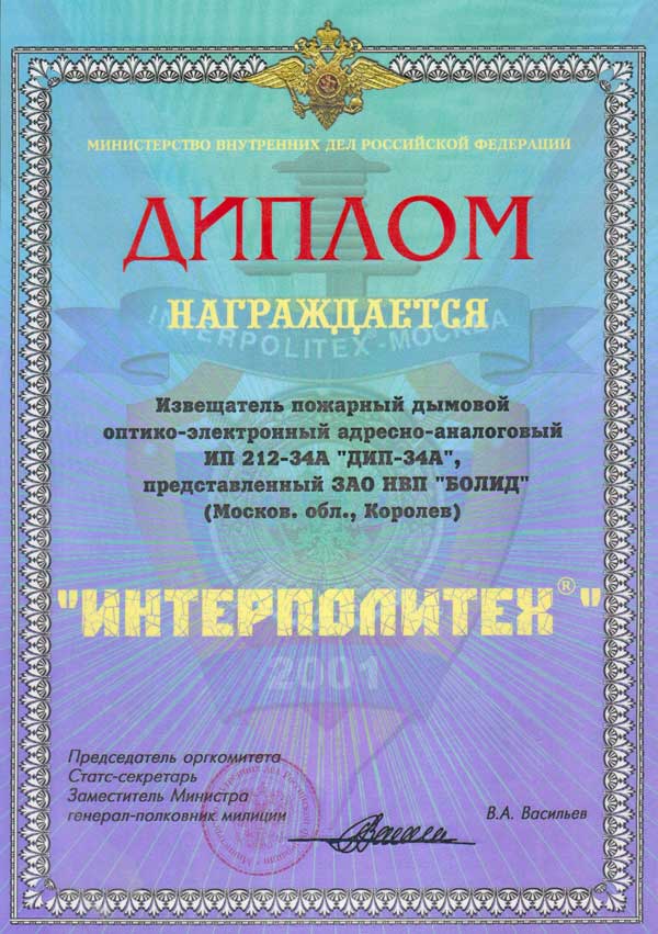 Награда: Диплом за "Извещатель пожарный дымовой оптико-электронный адресно-аналоговый ИП 212-34А "ДИП-34А"