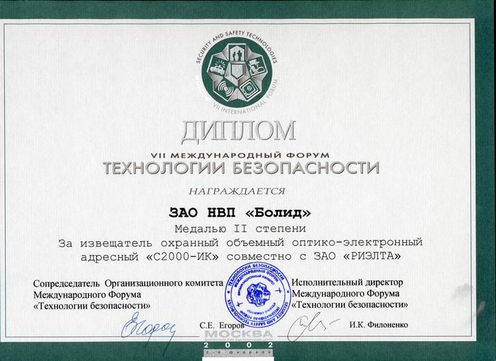 Награда: Диплом и медаль II степени за извещатель охранный объемный оптико-электронный адресный "С2000-ИК"