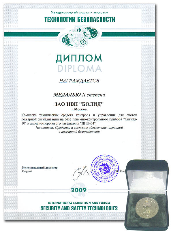 Награда: Медаль II степени за "Комплекс технических средств контроля и управления для систем пожарной сигнализации на базе приемно-контрольного прибора "Сигнал-10" и адресно-порогового извещателя "ДИП-34"