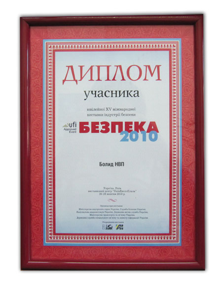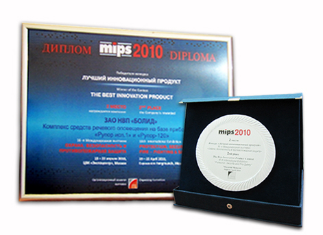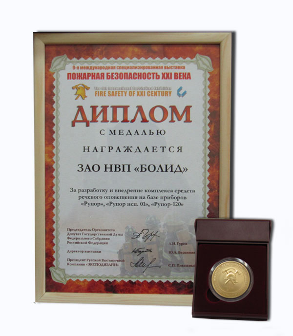 Награда: Диплом за "Комплекс средств пожарной сигнализации на базе ППКП "Сигнал-10" и адресно-порогового извещателя "ДИП-34ПА"