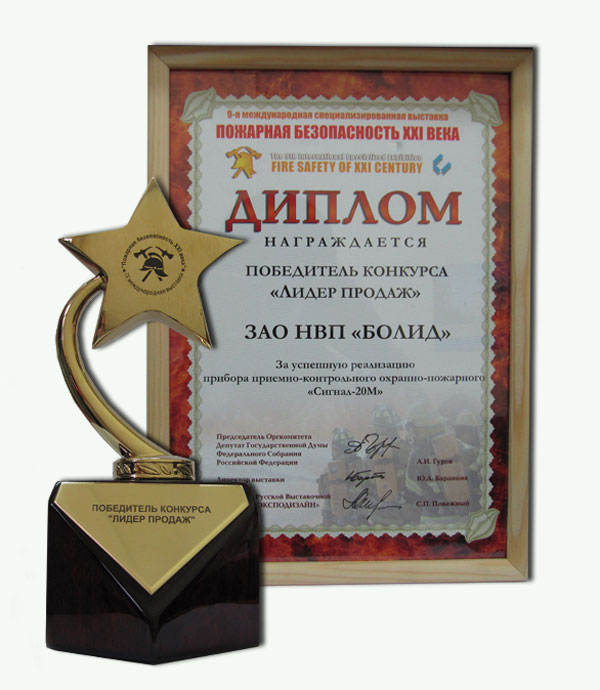 Награда: Диплом победителю конкурса "Лидер продаж" за успешную реализацию прибора приёмно-контрольного охранно-пожарного "Сигнал-20М"
