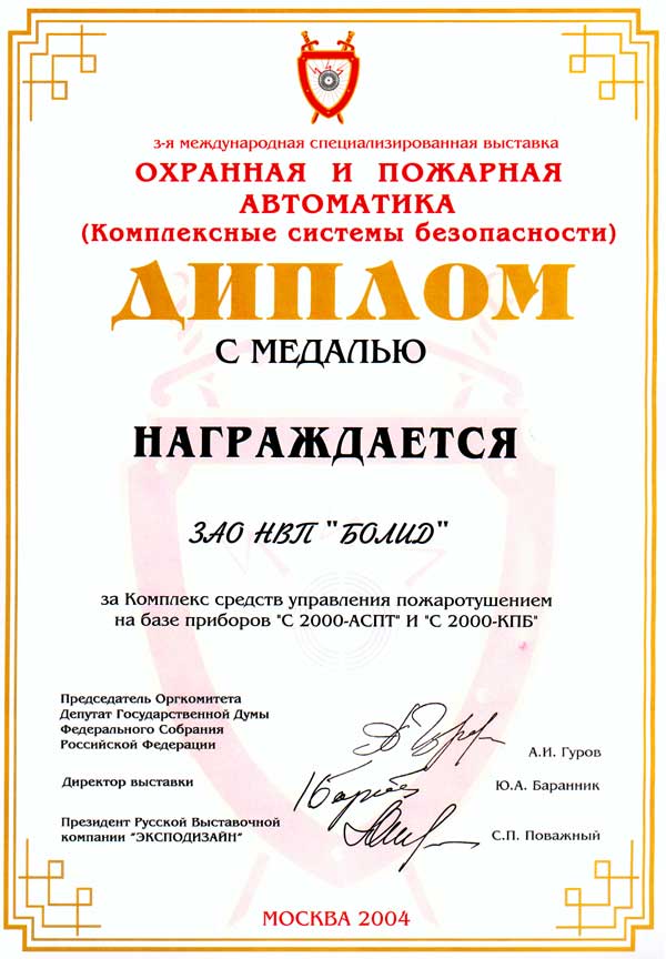 Награда: Диплом с медалью за "Комплекс средств управления пожаротушением на базе приборов "С2000-АСПТ" и "С2000-КПБ"