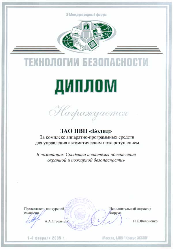 Награда: Диплом "За комплекс аппаратно-программных средств для управления автоматическим пожаротушением" в номинации "Средства и системы обеспечения охранной и пожарной безопасности"
