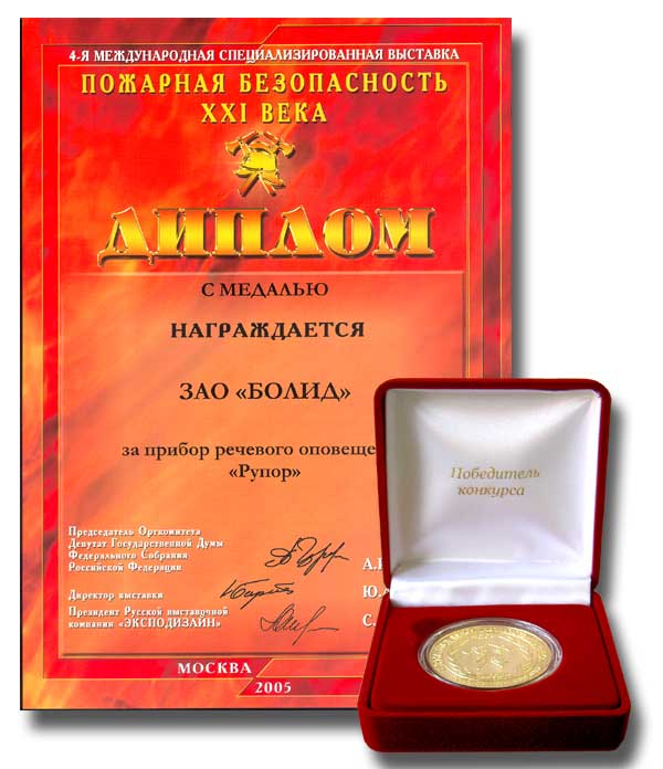 Награда: Диплом и медаль выставки за прибор речевого оповещения "Рупор" в номинации "Средства и системы охранно-пожарной сигнализации и автоматики"
