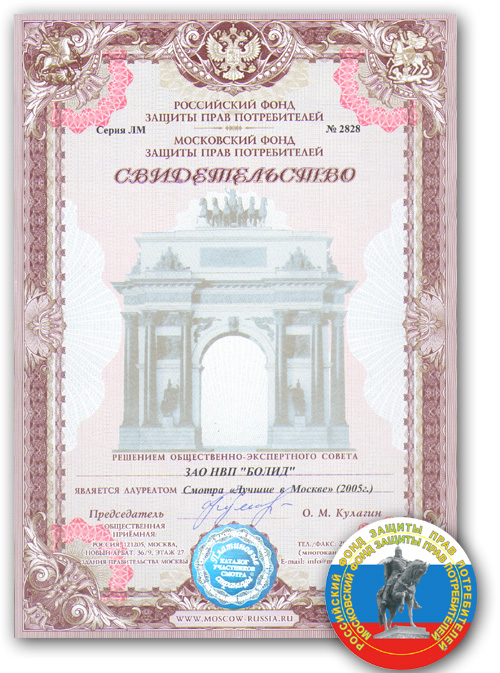 Награда: Свидетельство Лауреата Смотра "Лучшие в Москве" (2005 г.), право использования ЗНАКА ОБСЛУЖИВАНИЯ Российского и Московского фондов защиты прав потребителей с изображением ЮРИЯ ДОЛГОРУКОГО.