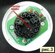 НВП "Болид" ранее проведены запредельные испытания на воздействие конденсата влаги на ДИП-34А (рис.2,3). В результате оказалось, что работоспособность извещателя не нарушается даже тогда, когда капли влаги появляются внутри корпуса и дымовой камеры. Текущее значение фонового сигнала изменялось не более, чем на 10%. Таким образом, определено, что чистая вода не отражается на работоспособности извещателя. Воздействие же влаги от протечек, без своевременной промывки и очистки, приводит к полной потере работоспособности. НВП "Болид" получал в ремонт извещатели, на печатной плате которых были протравлены выводы элементов схемы и проводники платы.