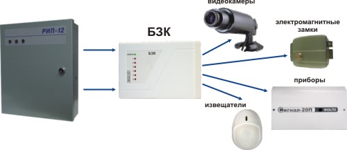 БЗК предназначен для распределения тока источника питания (РИП-12, РИП-24 или им подобным) по 6 каналам с индивидуальной защитой по току. Каждый канал оснащён самовосстанавливающимся предохранителем и индикатором красного цвета (индикаторы "1" - "6"), индицирующим перегрузку по току любого из 6-ти каналов. Зелёный индикатор "Работа" индицирует наличие напряжения на входе. БЗК обеспечивает защиту от "переполюсовки" входного напряжения, а также от превышения входного напряжения свыше 30 В (коммутационных выбросов и т.п.) с последующим восстановлением работоспособности.