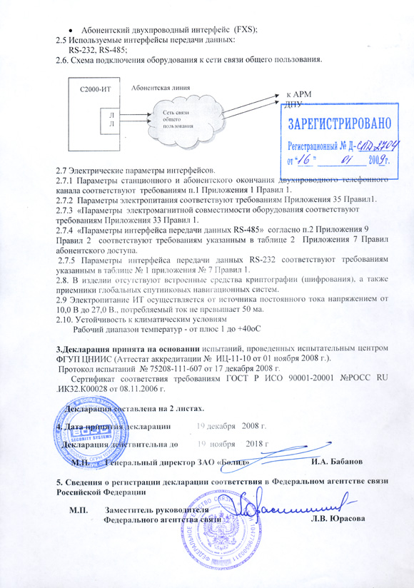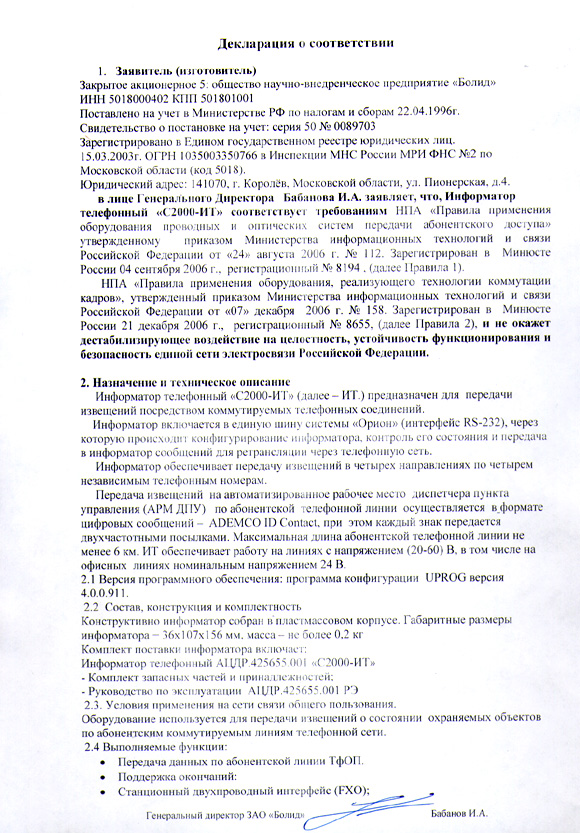 информатора телефонного "С2000-ИТ" требованиям НПА "Правила применения оборудования проводных и оптических систем передачи абонентского доступа" и НПА "Правила применения оборудования, реализующего технологии коммутации кадров", утвержденным приказами Министерства информационных технологий и связи.