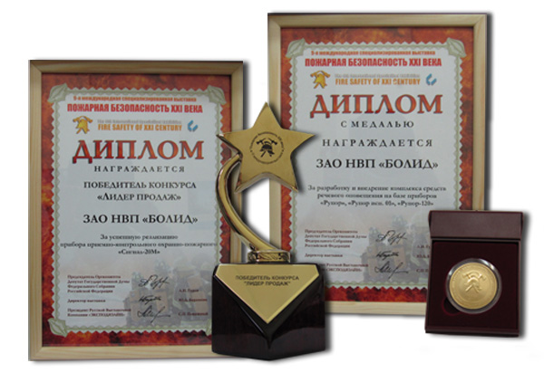 По итогам выставки наша компания стала победителем конкурса "Лидер продаж" - за успешную реализацию прибора приёмно-контрольного охранно-пожарного "Сигнал-20М". Кроме того, мы были награждены медалью - за разработку и внедрение комплекса средств речевого оповещения на базе приборов "Рупор", "Рупор исп.01", "Рупор-120".
