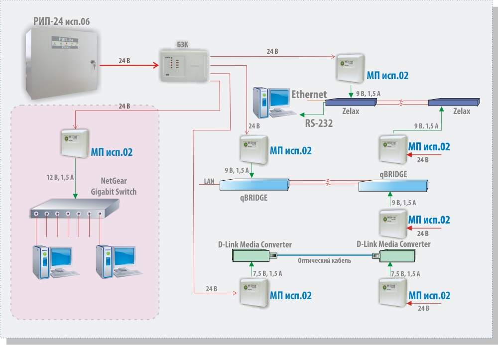 • питание устройств стабилизированным напряжением, исключающее возникновение сбоев в вычислительных сетях