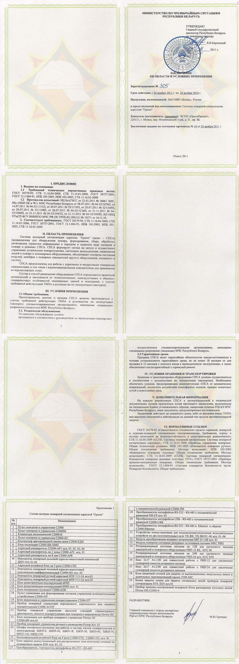 После этого адресная пожарная сигнализация ИСО "Орион", а так же приборы речевого оповещения и автоматики пожаротушения прошли экспертизу в МЧС Республики Беларусь и получили положительное