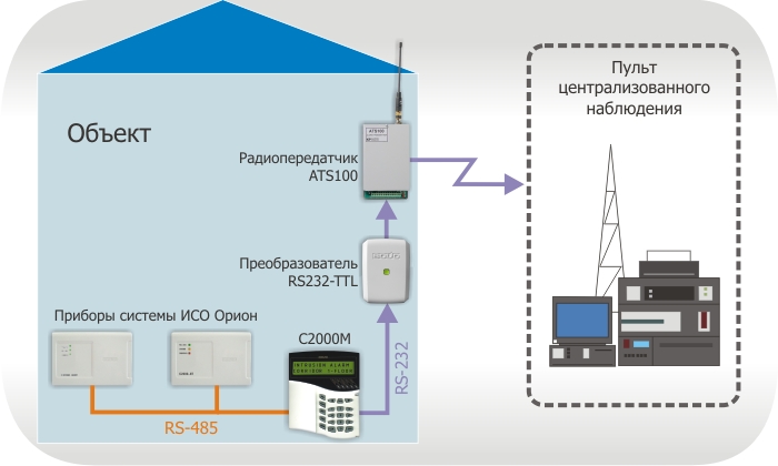 Преобразователь <b><a href="/production/orion/interface-converter/rs232-ttl.html" title="Преобразователь интерфейсов RS232-TTL">RS232-TTL</a></b> предназначен для подключения радиопередатчика ATS100 радиосистемы передачи извещений LARS к пульту контроля и управления "С2000М" системы охраны "Орион". Радиопередатчики ATS100 позволяют передавать сообщения с объектов, оборудованных системой охраны "Орион", на пульты централизованного наблюдения, оснащенные радиоприемным оборудованием LARS.