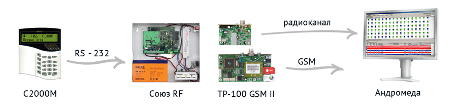 Ключевым устройством интеграции служит преобразователь форматов — Союз RF. Пульт контроля и управления "С2000М" подключается к "Союз RF" через последовательный порт RS-232 и передает ему свои сообщения в цифровом виде. Это позволяет передавать информацию из охранно-пожарной системы объекта в ЦСМ "Андромеда" по радиоканалу и GSM.