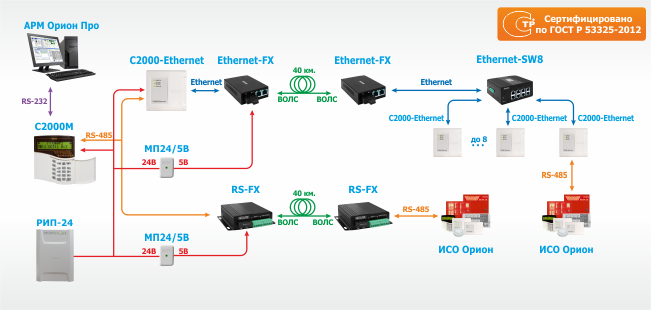Может использоваться совместно с волоконно-оптическими преобразователями "Ethernet-FX" для разветвления сети. А также для объединения в сеть приборов "С2000-Ethernet", "Рупор-200" и других приборов, работающих по интерфейсу Ethernet.