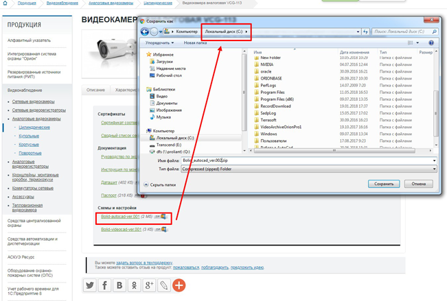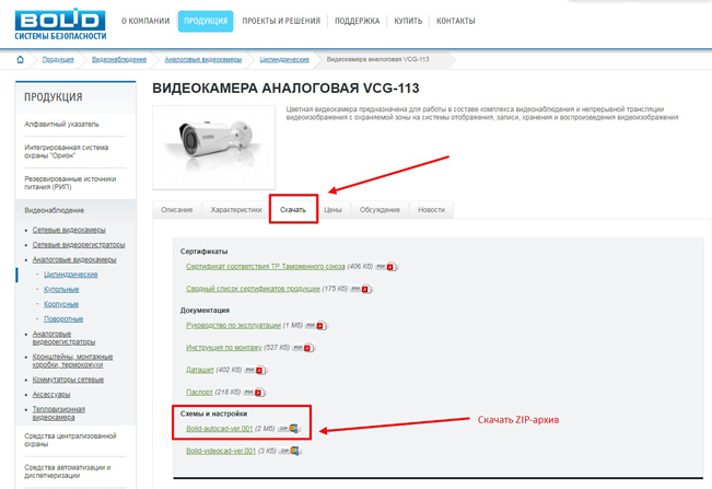 Путь: Продукция / Сетевые камеры (или Аналоговые камеры) / Видеокамера сетевая VCI-113 (или любая другая камера), вкладка Скачать, раздел Схемы и настройки.