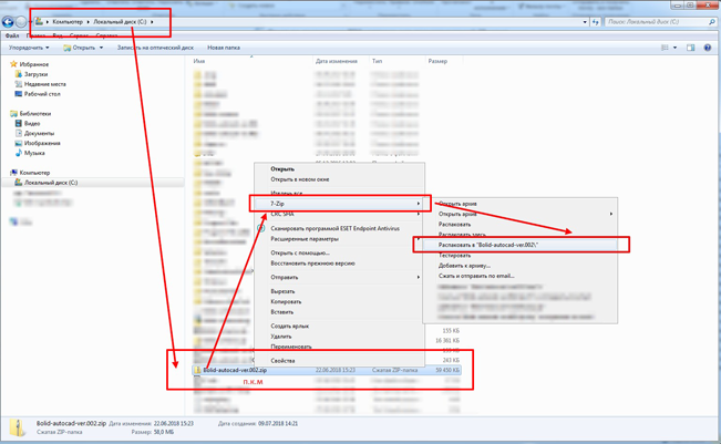 Если это возможно — сохраняйте архив в корневой каталог диска C. Далее распаковываем архив — например бесплатной программой 7-Zip.