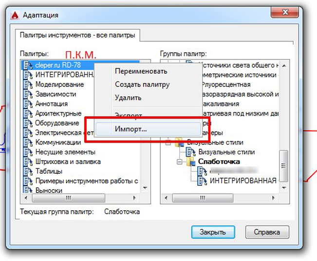 Далее необходимо в окне Адаптация в разделе Палитры П.К.М вызвать контекстное меню и выбрать пункт Импорт…