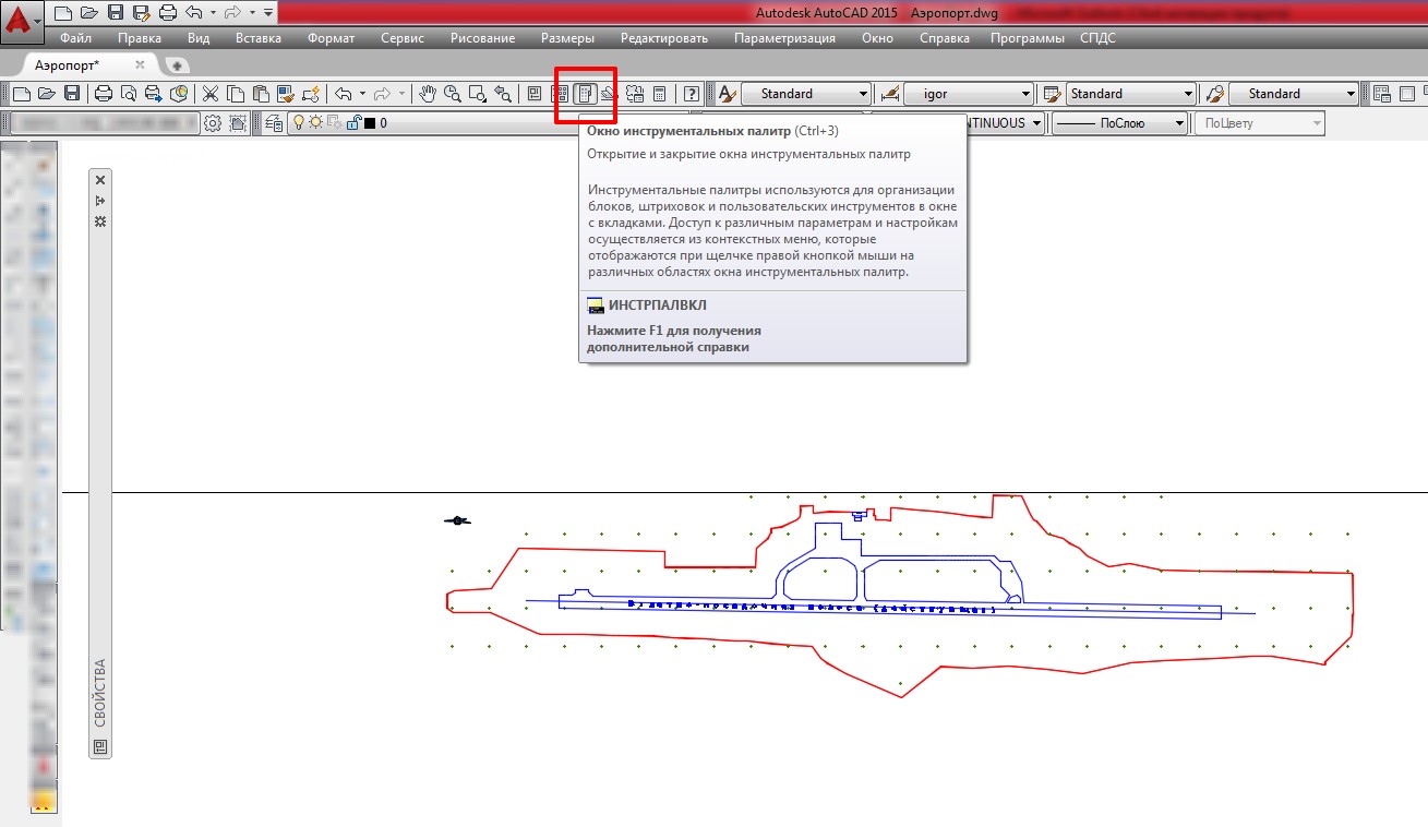 Первое, что мы должны сделать — подгрузить файл инструментальной палитры в AutoCAD. Открываем окно инструментальных палитр (Ctrl+3):
