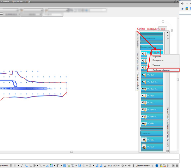 Если архив Bolid-autocad-ver.002.zip был распакован не в корень диска C, то необходимо прописать путь до файла с динамическими блоками камер "Болид" Bolid cameras.dwg. Для этого на панели инструментальных палитр нажмите Ctrl+A(выделить все), П.К.М. на камере в выпадающем контекстном меню выбрать Свойства объекта…