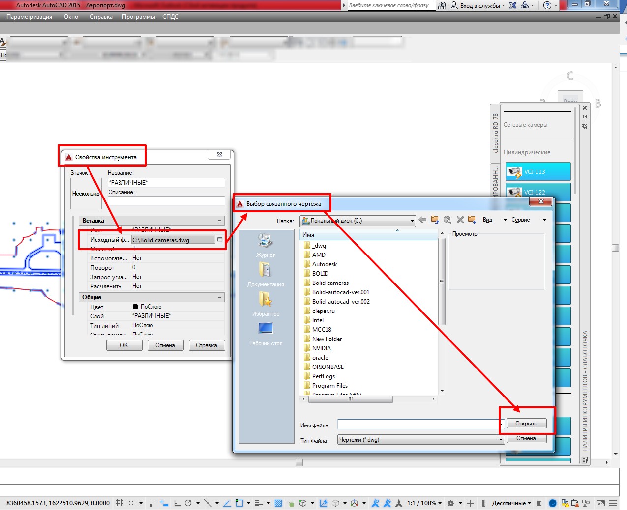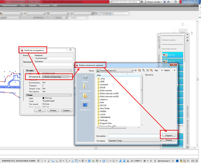 В блоке Вставка строка Исходный файл выбрать прямоугольник справа — появится окно Выбор связанного чертежа — указываем путь до Bolid cameras.dwg