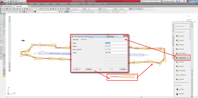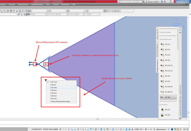В блоке есть возможность выбирать видимость зон обзора согласно фокусному расстоянию; поворачивать блок (поворот камеры в горизонтальной плоскости); масштабировать УГО камеры
