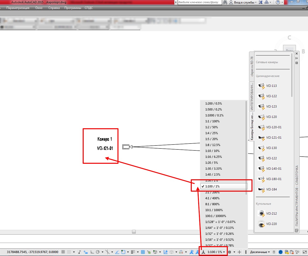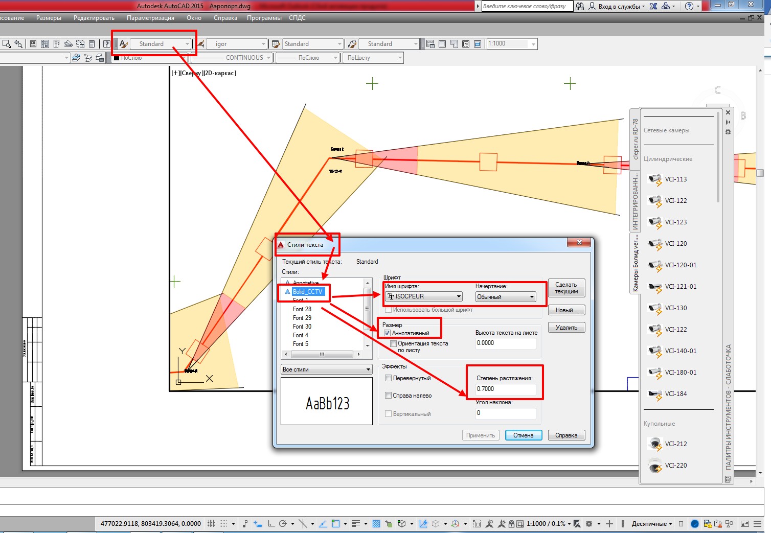 Чтобы изменить размер шрифта всех текстовых элементов блоков камер в чертеже, достаточно указать масштаб аннотации.