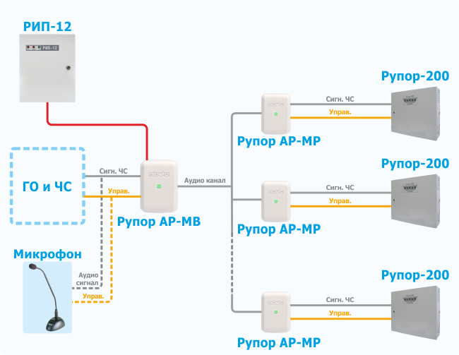 Для использования комплекта достаточно приобрести один модуль "Рупор-АР-МВ" и модули "Рупор-АР-МР" в количестве, равном количеству подключаемых "Рупор-200".