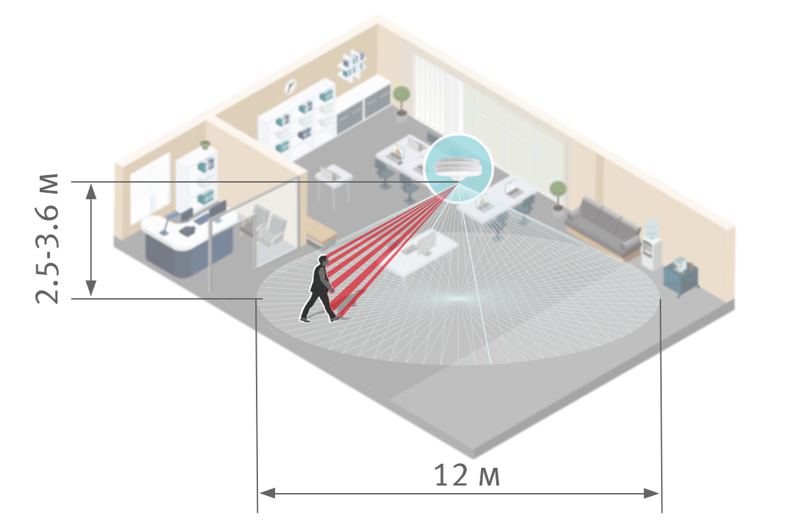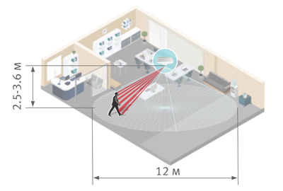 - Диаметр зоны обнаружения 12 м (при высоте установки 2,5-3,6 м)