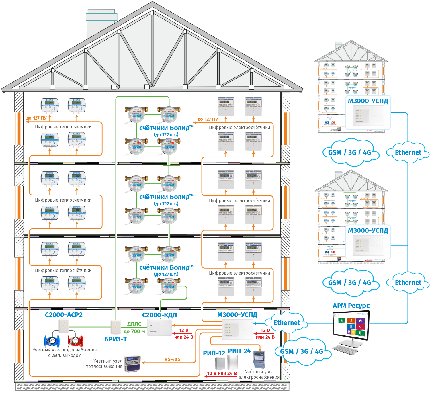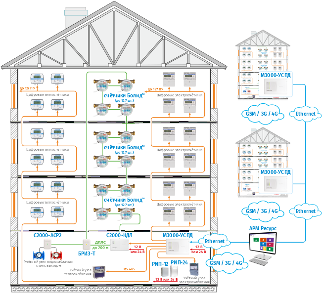 Использование устройства «М3000-УСПД» обеспечивает стабильность работы системы АСКУЭ «Ресурс» на территориально и организационно распределенных объектах. Позволяет не терять массив данных из-за временных сбоев в работе сетей Ethernet/GSM, предоставляет возможность использовать один прибор вместо пяти преобразователей интерфейса «С2000-Ethernet» и реализует разграничение доступа на сервер АРМ «Ресурс» при объединении в системе приборов учёта различных компаний.