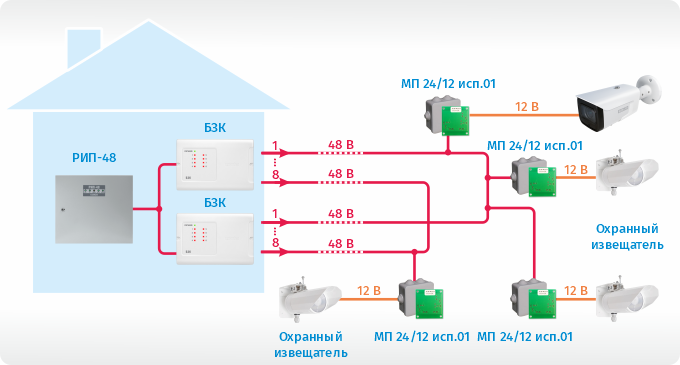Рисунок 2. Пример использования БЗК исп.03 с РИП-48 исп.01 на периметре: подключение к РИП-48 двух БЗК исп.03 по топологии «кольцо» и последующему подключению к линиям БЗК нагрузки через преобразователи напряжения.