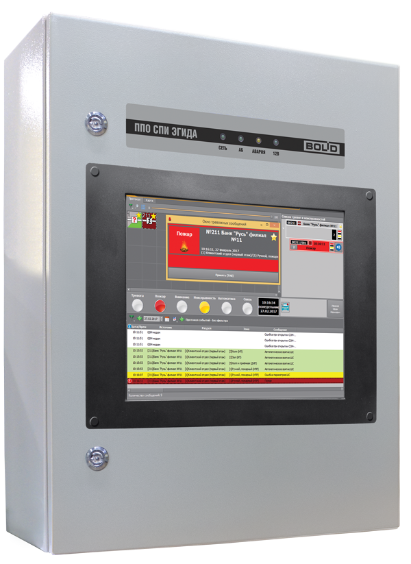 Приёмная часть КСПИ «Эгида» - прибор пультовой оконечный комбинированный системы передачи извещений «Эгида» (ППО КСПИ Эгида) разработан на базе промышленного ПК защищённого исполнения, включает все необходимые модули для приёма извещений по локальной сети, проводным телефонным линиям и каналам GSM/GPRS от приборов С2000-PGE, С2000-PGE исп.01, УО-4С исп.02.