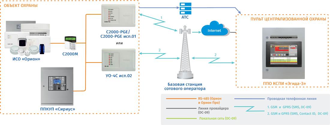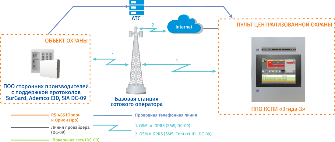 Пакетная передача данных от приборов оконечных объектовых возможна по каналам GPRS (мобильный интернет) и локальной сети на защищённый сетевой коммутатор SW08 при условии подключения ППО КСПИ Эгида к локальной сети со статическим сетевым адре­сом. В качестве резервного или основного канала может применяться способ передачи по каналу GSM SMS на пультовые устройства, входящие в состав ППО КСПИ «Эгида». Для объектов, где невозможно или нецелесообразно применение сотовой связи, оптоволоконной или локальной сети, можно использовать коммутируемую телефонную линию. Приём извещений осуществляется пультовым модулем УОП-3 GSM, подключенным к выделенной телефонной линии.