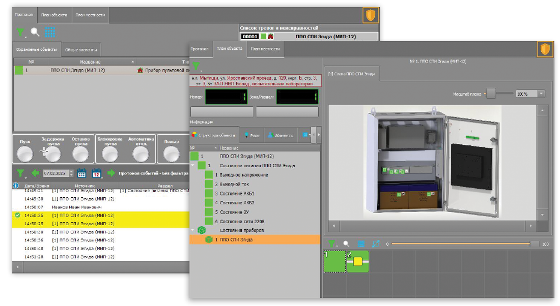 • Отображение мультисостояний объектов пожарной охраны, охра­няемых зон и разделов, состояний приборов в любой момент вре­мени на экране рабочего места