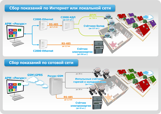 Рассмотрим основные варианты применения АСКУЭ «Ресурс» на примере многоквартирного жилого дома, коттеджного поселка и различных распределённых объектов.