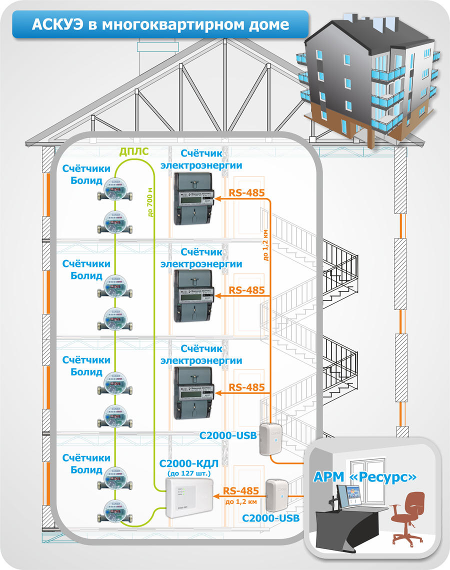 АСКУЭ может применяться в домах абсолютно любой конфигурации. Обычно в каждой квартире устанавливается несколько счётчиков. Например, это могут быть импульсные приборы учета холодной\горячей воды и цифровой счётчик электроэнергии. Так же к ним могут добавляться счётчики газа и тепла. Отличительная особенность подобных объектов – большое количество различных счётчиков и большая длинна линий связи внутри дома. Компьютер с ПО АРМ «Ресурс» может находиться, как в служебном помещение самого здания, так и в управляющей организации.