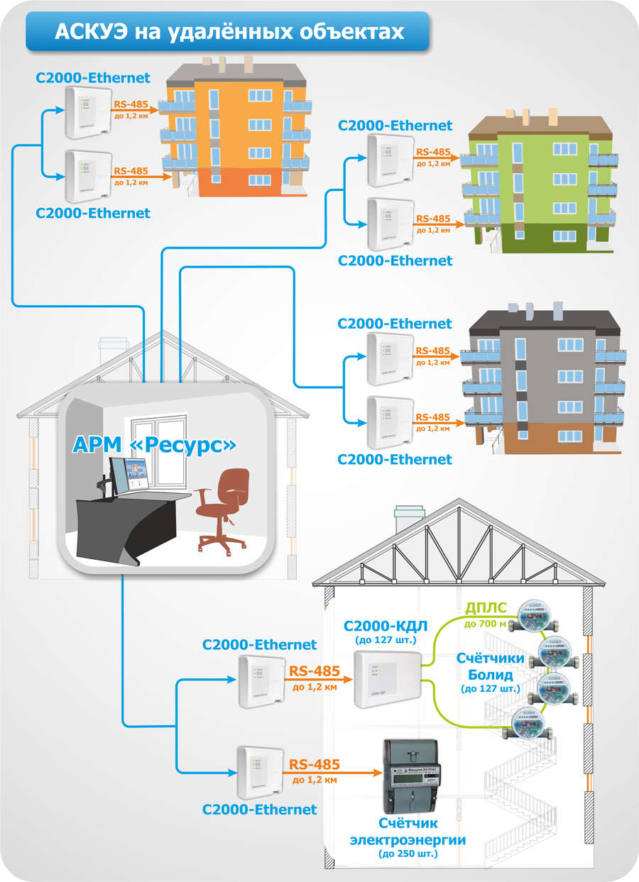 Основные преимущества АСКУЭ «Ресурс»:Удаленные объекты часто характеризуются большим расстоянием между составными частями. Для решения задачи передачи данных наиболее удобно использовать линии Ethernet и Internet. В случае их недоступности, можно транслировать RS-485 интерфейс через радиоканал (прибор С2000-РПИ) или сотовую сеть GSM (сторонние модемы).