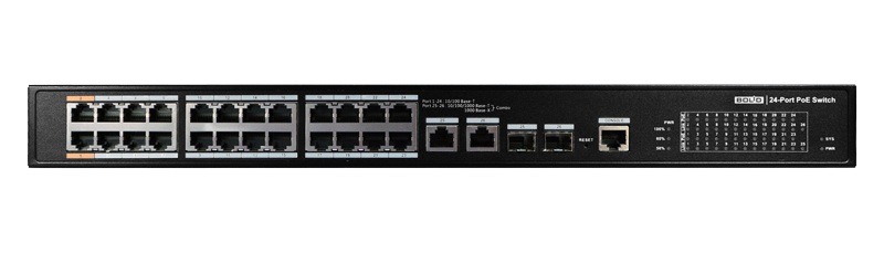 • 24 порта RJ-45 10/100 Мбит/с (PoE Источник питания), 2 комбо-порта RJ-45 10/100/1000 Мбит/с (uplink)/ SFP 1000 Мбит/с (uplink)