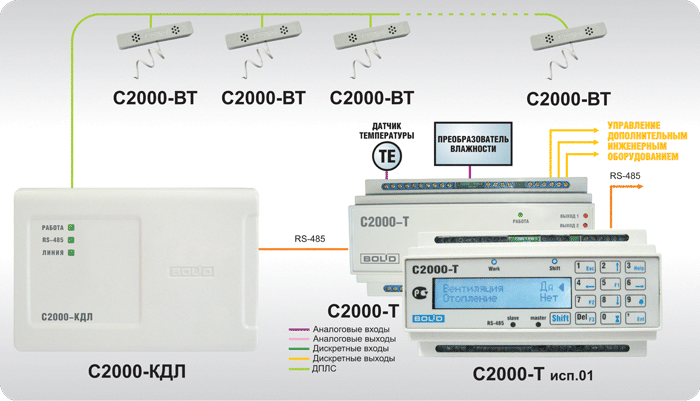 Развитые сетевые возможности контроллера С2000-Т позволяют подключать различные ведомые устройства, которые контроллер подхватывает автоматически. Так, из подключенной сети двухпроводной линии связи (ДПЛС), через прибор производства НВП «Болид» С2000-КДЛ, являющийся контроллером ДПЛС и подключенный к С2000-Т по интерфейсу RS-485, ведущий контроллер может получать данные с датчиков температуры и влажности С2000-ВТ. Через один контроллер ДПЛС доступно для мониторинга до 60 датчиков температуры и влажности. Кроме того, дополнительно к самому контроллеру С2000-Т можно подключить до 6 температурных датчиков TE или различных преобразователей влажности. Это позволяет строить разветвленные системы мониторинга на таких объектах, как архивы, библиотеки, музеи и др. Пользователю, при помощи Блока условий контроллера С2000-Т, не составит труда запрограммировать собственные дискретные выходы на включение дополнительных устройств, например: осушителя, кондиционера или вытяжного вентилятора по пороговому значению с любого датчика.