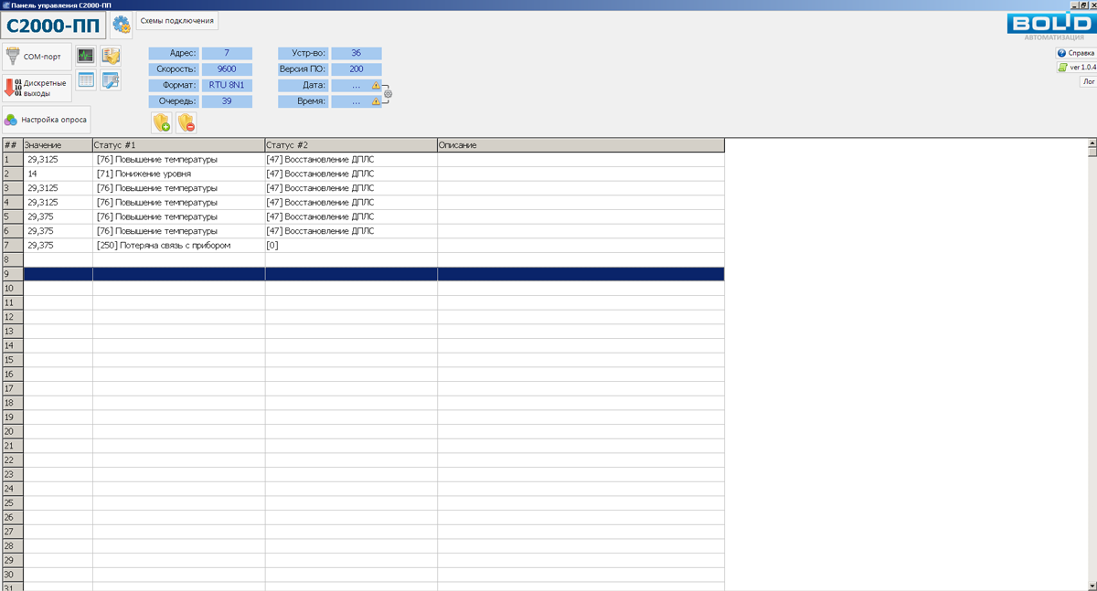 С2000-КДЛ-Modbus может получать данные с датчиков температуры и влажности С2000-ВТ. Через один контроллер ДПЛС доступно для мониторинга до 60 датчиков температуры и влажности. Подключение через преобразователь 485 в usb позволяет посмотреть с помощью бесплатной программы «Панель управления С2000-ПП» текущие значения температуры.