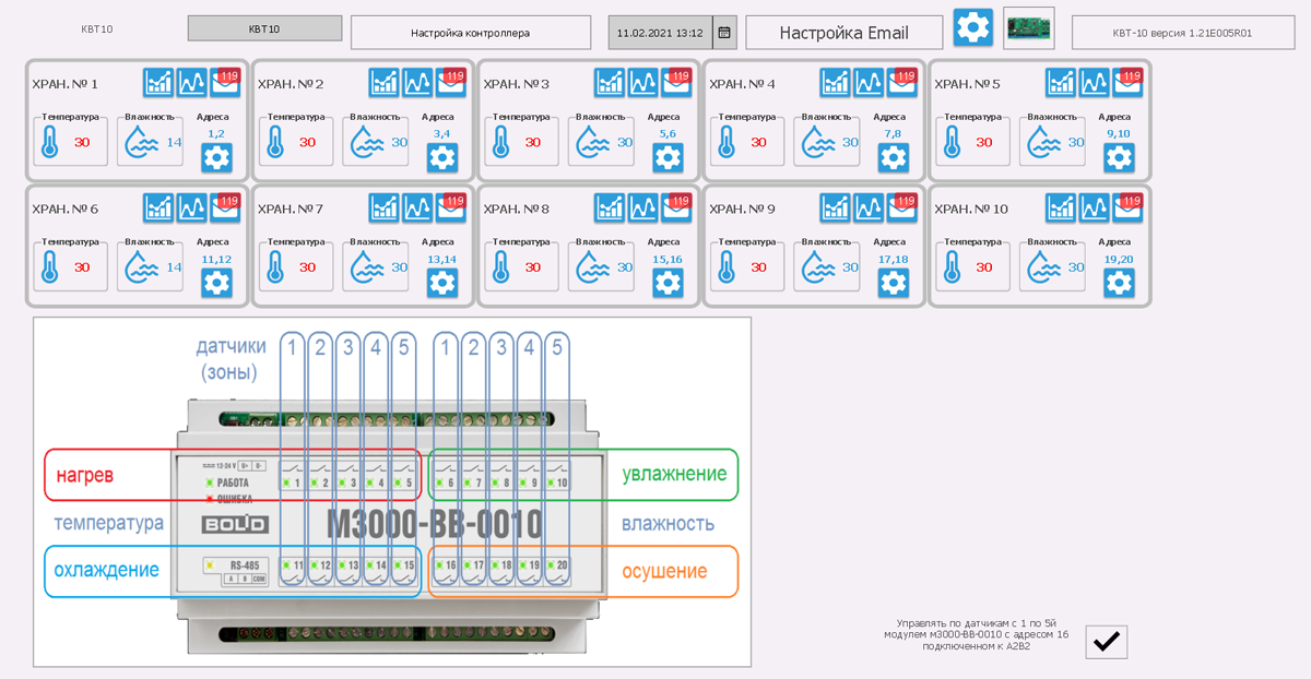 Получая значения в С2000-КДЛ-Modbus, датчиков С2000-ВТ (аналогично комплекту КВТ) с возможностью управления температурой и влажностью с помощью реле модуля М3000-ВВ-0010 с заводскими сетевыми настройками, подключенного к интерфейсу Rs485-2, управление возможно осуществлять 5-ю зонами по превышению/принижению температуры либо влажности.