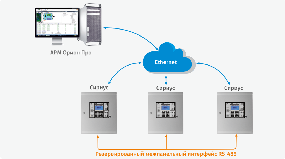 Внимание! При организации АРМ в СПА с использованием нескольких ППКУП «Сириус» каждый из приборов должен быть подключен к сети Ethernet. Это правило также обязательно в случаях, если ППКУП «Сириус» объединены резервированным интерфейсом верхнего уровня.