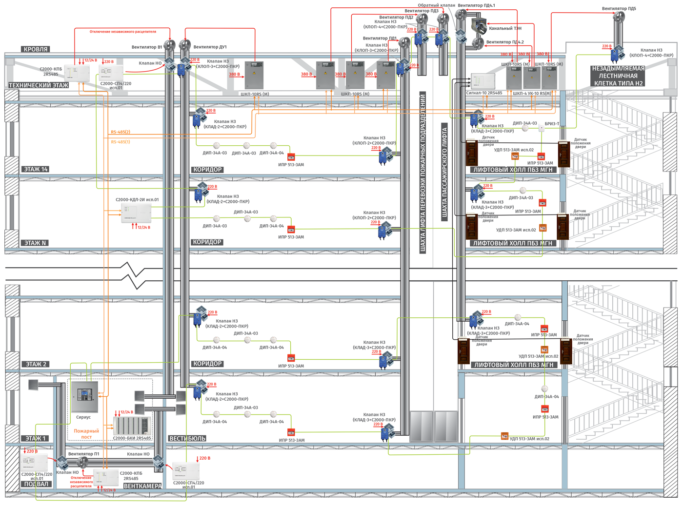 Управление системой противодымной защиты предусмотрено от системы пожарной сигнализации ИСО «Орион», (в автоматическом режиме), с пульта «С2000М», прибора «Сириус» или блока «С2000-БКИ 2RS485» в помещении пожарного поста (дистанционно), от устройств дистанционного пуска, устанавливаемых у эвакуационных выходов с этажей в соответствии с СП 7.13130-2013.