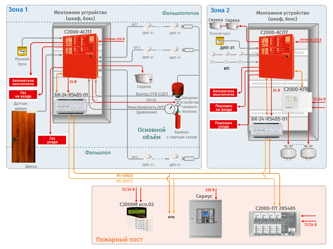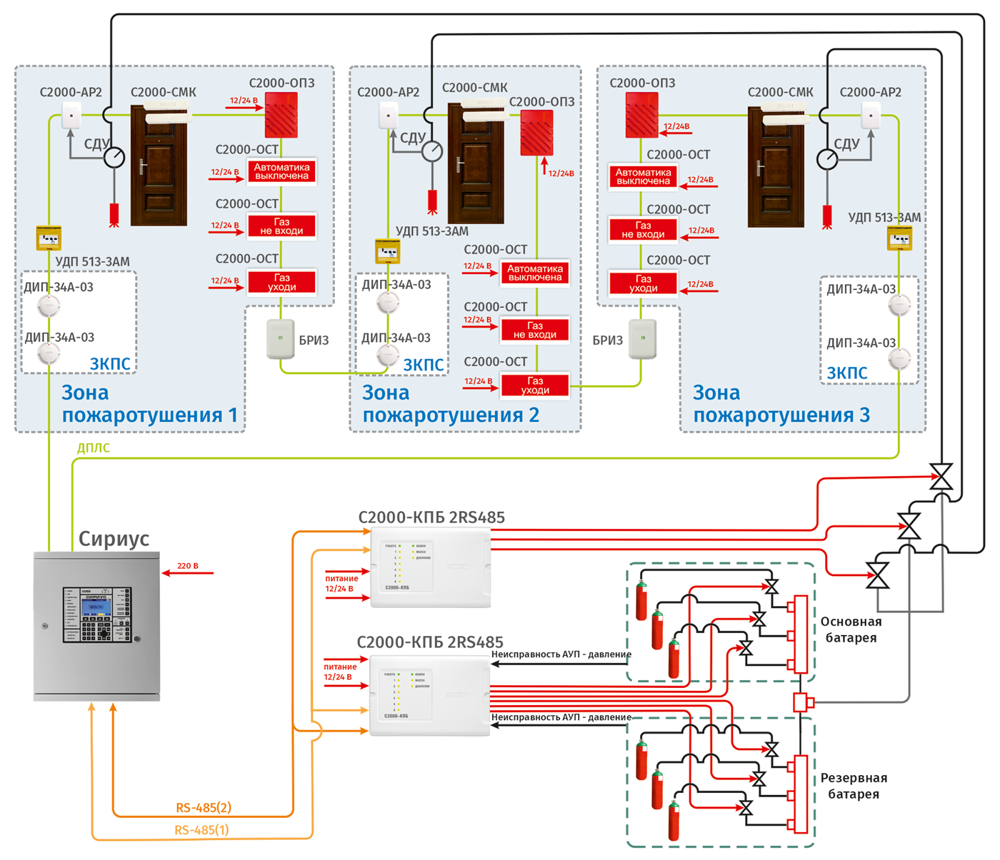 Один "Сириус" без дополнительных блоков, подключаемых к резервированному интерфейсу, может использоваться для четырех зон газового пожаротушения.
