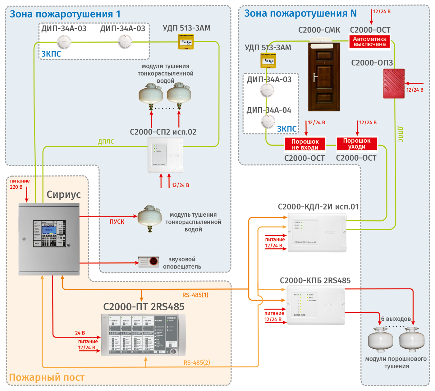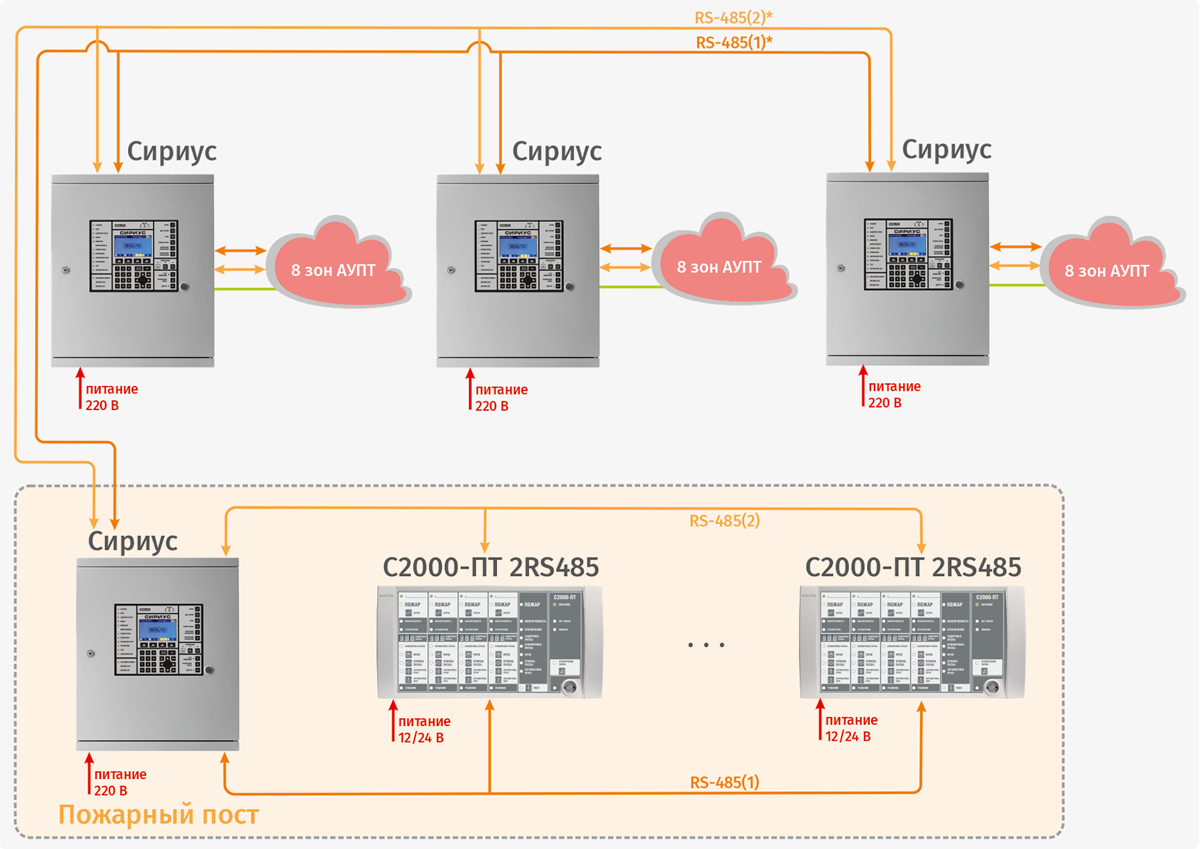 Реализация систем пожаротушения большого числа зон.Также ППКУП «Сириус», применяемые в АУП в качестве приборов управления, не рекомендуется одновременно использовать, как сетевой контроллер в других системах СПА объекта (СПС, СОУЭ, СПДВ). Приборы «Сириус», управляющие АУП, объединяются интерфейсом верхнего уровня с приборами «Сириус», управляющими другими СПА, для вывода сигналов на пожарный пост.