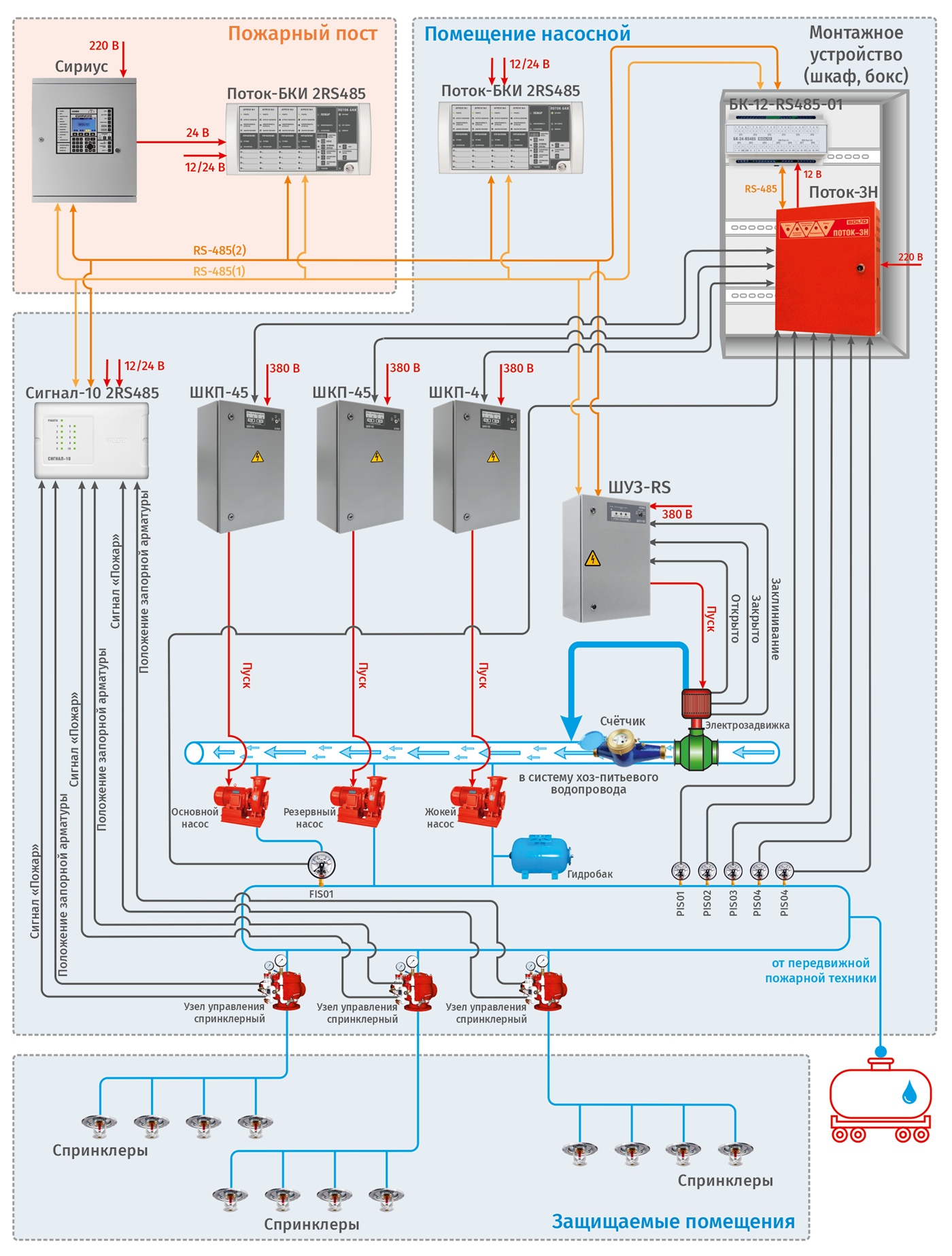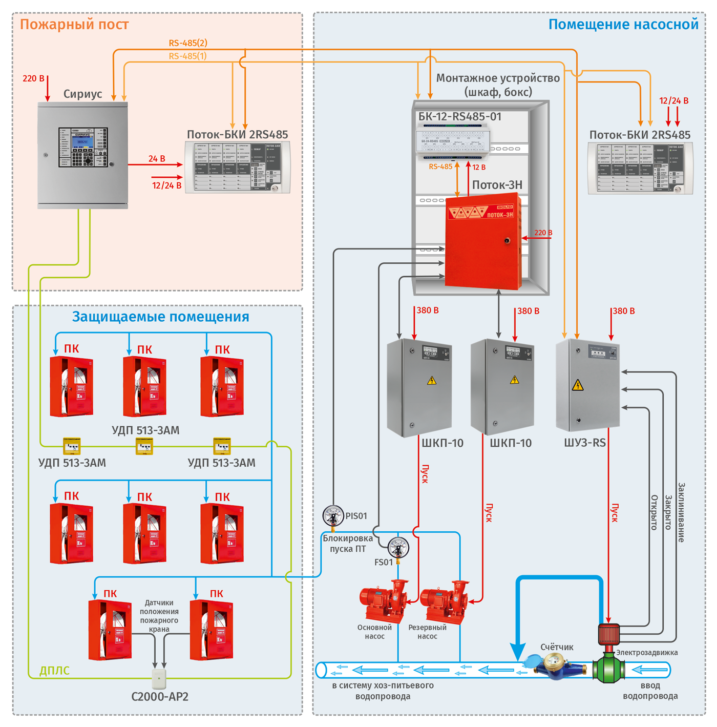 Блок индикации и управления «Поток-БКИ 2RS485», размещенный в помещении пожарного поста, реализует требуемые ручной (дистанционный) пуск установки, индикацию состояний насосов и текущего режима установки (режимы ручного или автоматического управления по каждому агрегату), положения электрозадвижки, включение звуковых сигналов при неисправности или пожаре. Блок «Поток-БКИ 2RS485», расположенный в помещении насосной, кроме аналогичной индикации, предназначен для осуществления местного пуска тушения или сброса пуска. Также для организации местного пуска можно использовать «УДП-513-3АМ», включенные в ДПЛС, или «УДП- 513-3М», подключенный к свободном входу «Поток-3Н». ППКУП «Сириус» необходим для взаимодействия между блоками «Поток-3Н», «ШУЗ-RS», «Поток-БКИ 2RS485», регистрации происходящих событий с сохранением в электронном журнале. Для выполнения требований СП484 п.5.4 блоки «ШУЗ-RS», «Поток-БКИ 2RS485» оснащены резервированным интерфейсом RS-485, а «УДП-513-3АМ» встроенным изолятором КЗ.