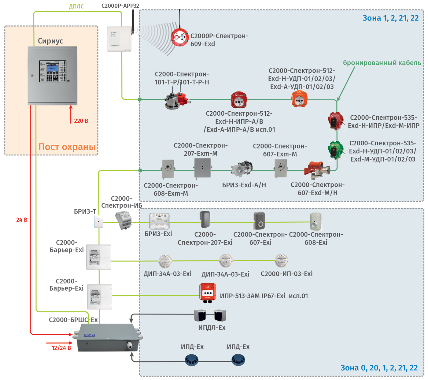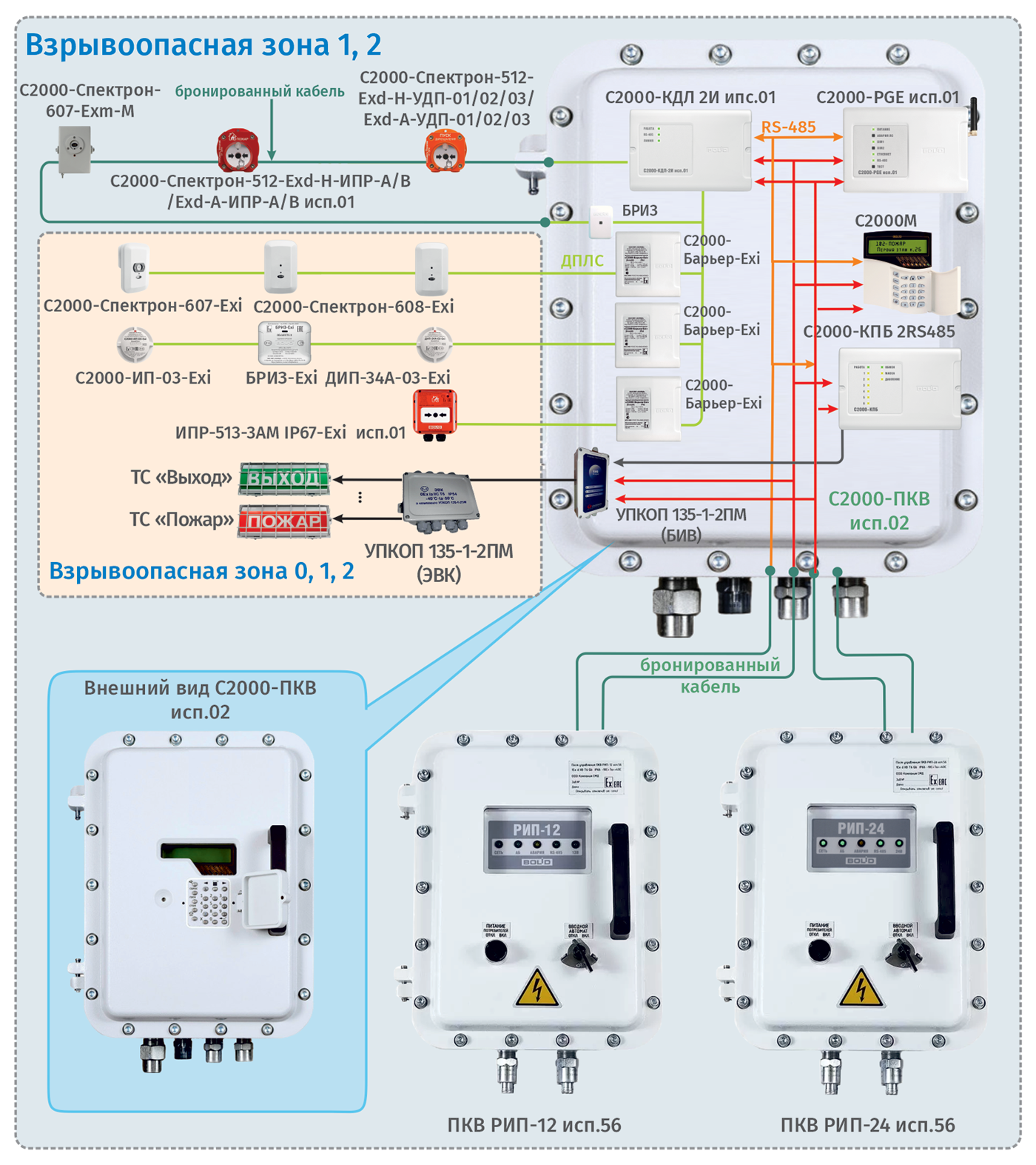 В случае если весь защищаемый объект представляет собой взрывоопасную зону I или II, для его защиты можно применить специальные комплекты, представляющие собой пульт «С2000М исп.02», блок «С2000-КДЛ» и другие блоки, размещенные внутри защищенной оболочки. Комплект из пульта и оболочки с местом для размещения 4 блоков называется «С2000-ПКВ исп.02». Для питания комплекта можно использовать ИБП «ПКВ РИП-12 исп.56» или «ПКВ РИП-24 исп.56», фактически являющиеся источниками питания «РИП-12 исп.56» и «РИП-24 исп.56», размещенными во взрывозащищенной оболочке. Оболочки имеют маркировку взрывозащиты 1Ex d IIB T6..J4 Gb/ Ex tb IIIB T850C ... T1350C Db.